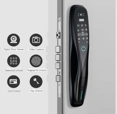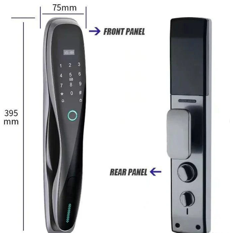 Ce modèle est l'évolution ultime de la sécurité domestique. Il s'agit d'une serrure intelligente automatique qui intègre un judas électronique (Maoyan) et un système d'interphone vidéo. Elle permet non seulement un déverrouillage multi-méthodes, mais vous offre également une vue en temps réel et la possibilité de communiquer avec les visiteurs directement depuis votre smartphone via l'application Tuya. Conçue en alliage d'aluminium pour une durabilité maximale.